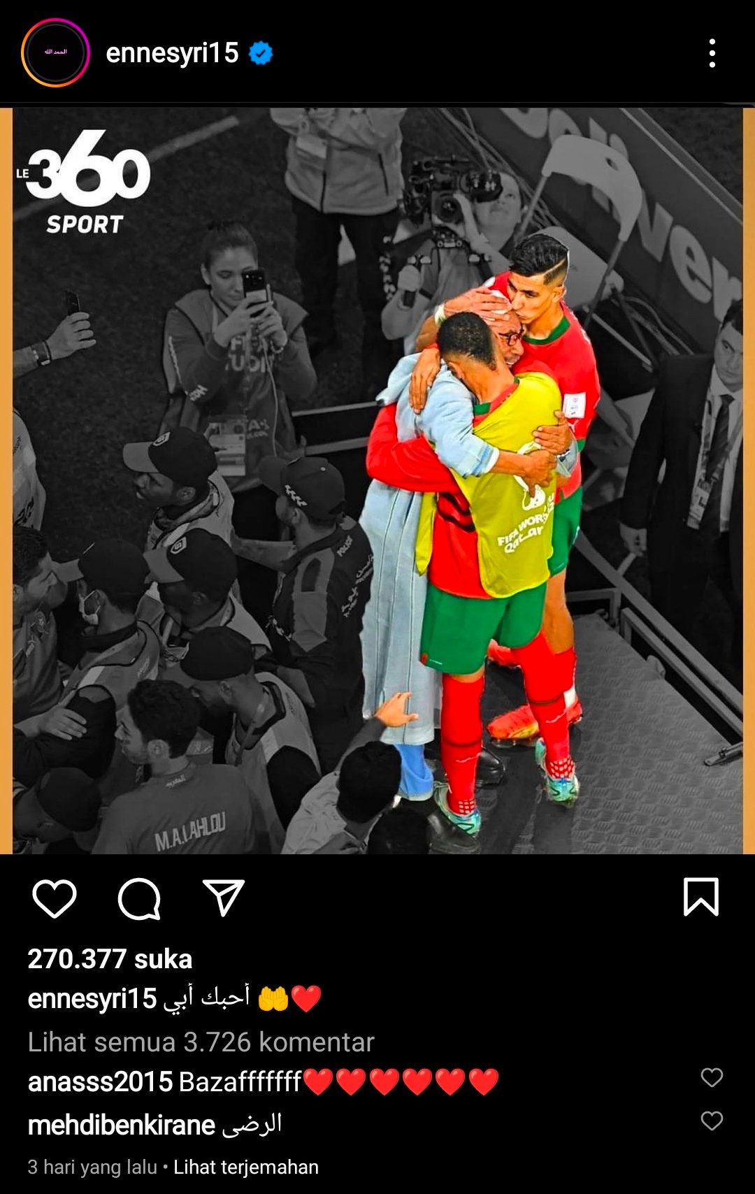 Ada lagi pahlawan kemenangan Maroko pencetak gol En-Nesyri juga menunjukkan di akun instagramnya @ennesyri15 kedekatan bersama orang tua. Pemain klub Sevilla ini mengunggah foto saat memeluk sang ayah. “Uhibbuka abi,” artinya “Saya mencintaimu ayah,” tulis En-Nesyri.